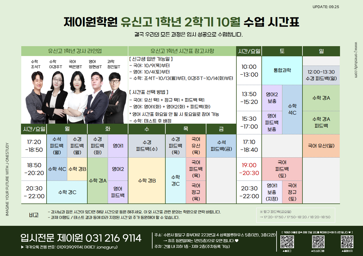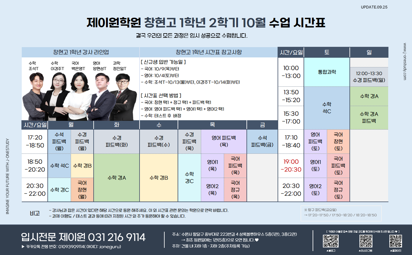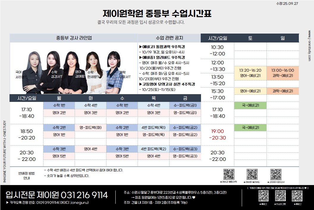 제이원학원 10월 학년별 주요 내용 및 시간표 안내 드립니다.