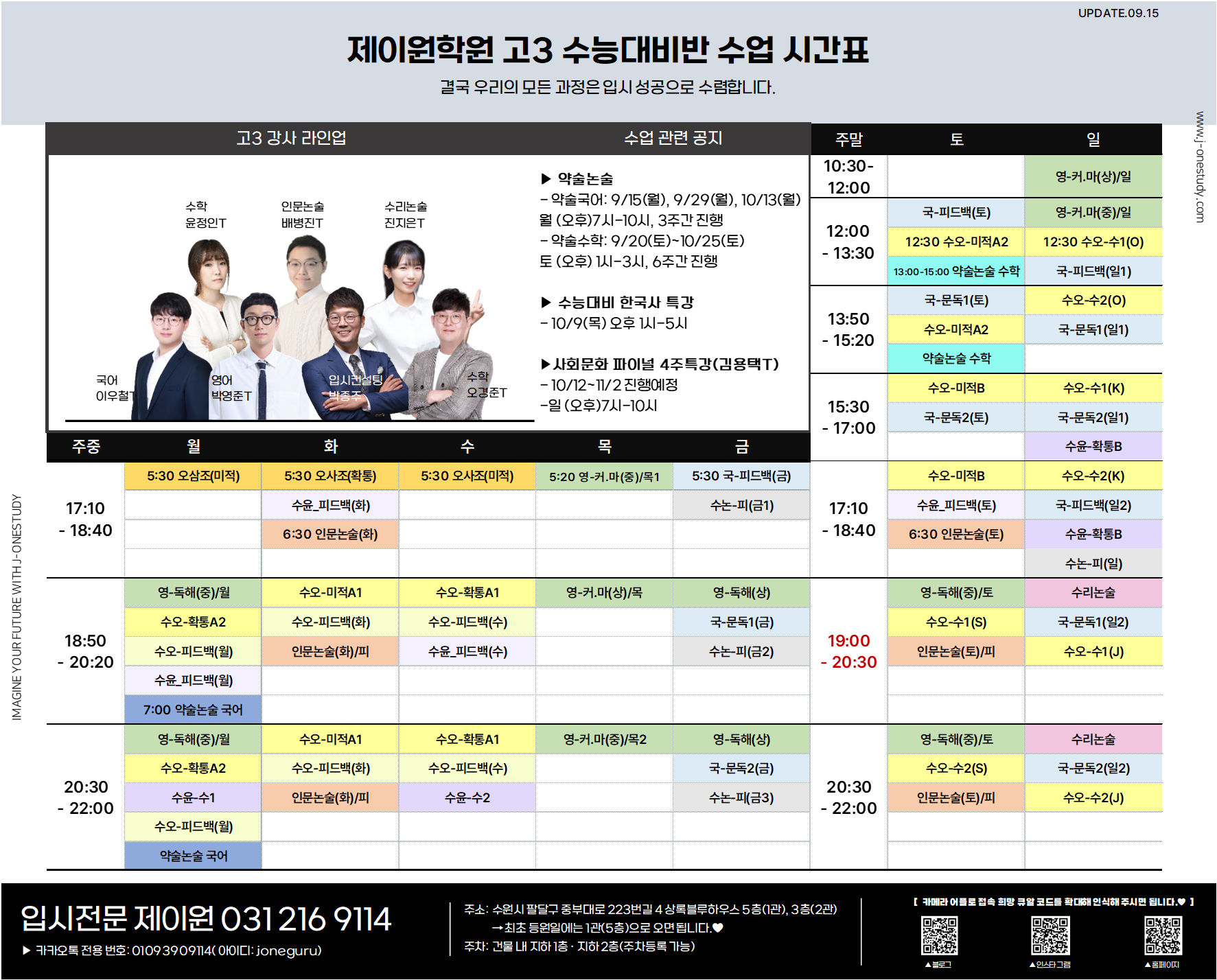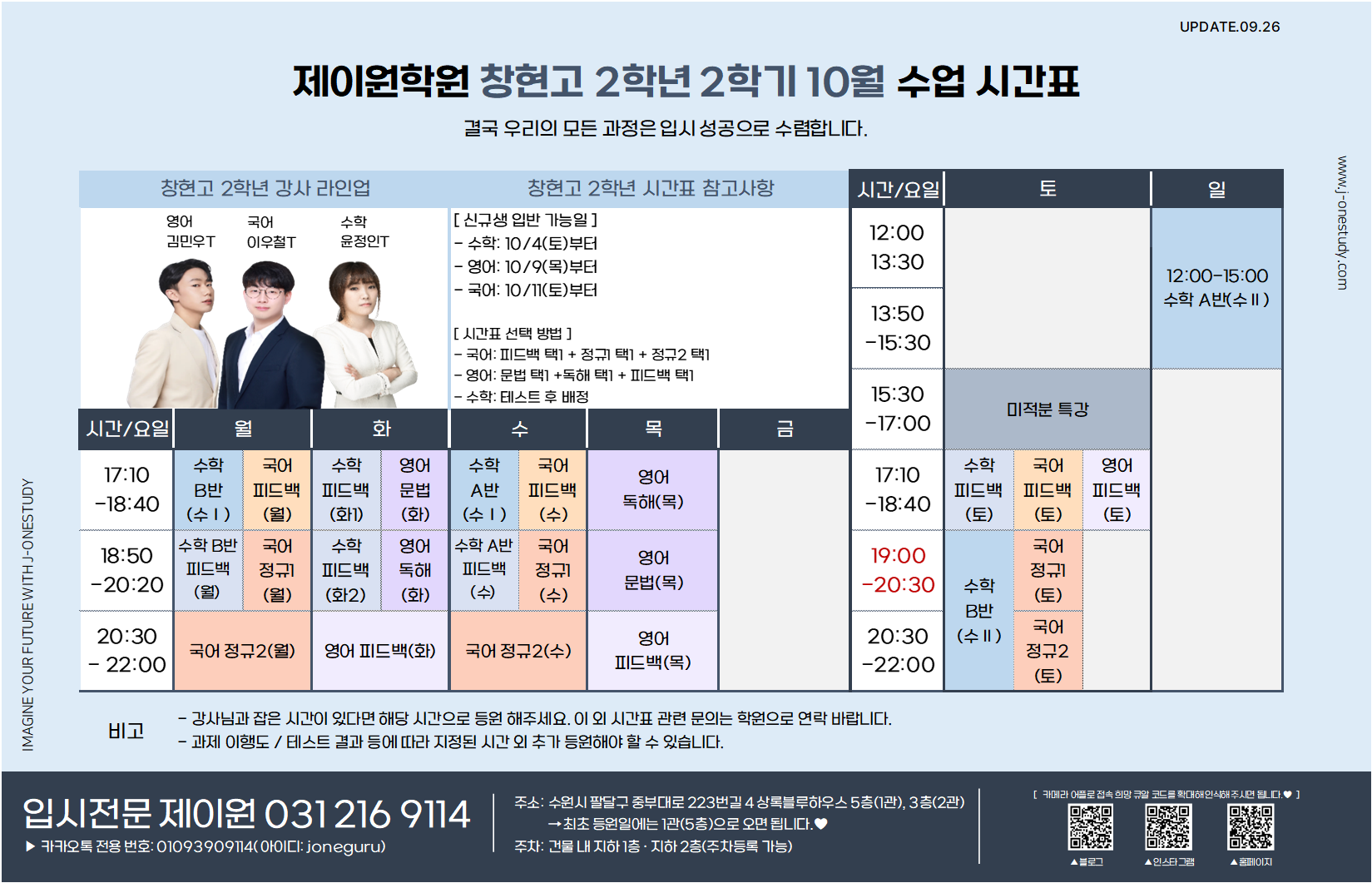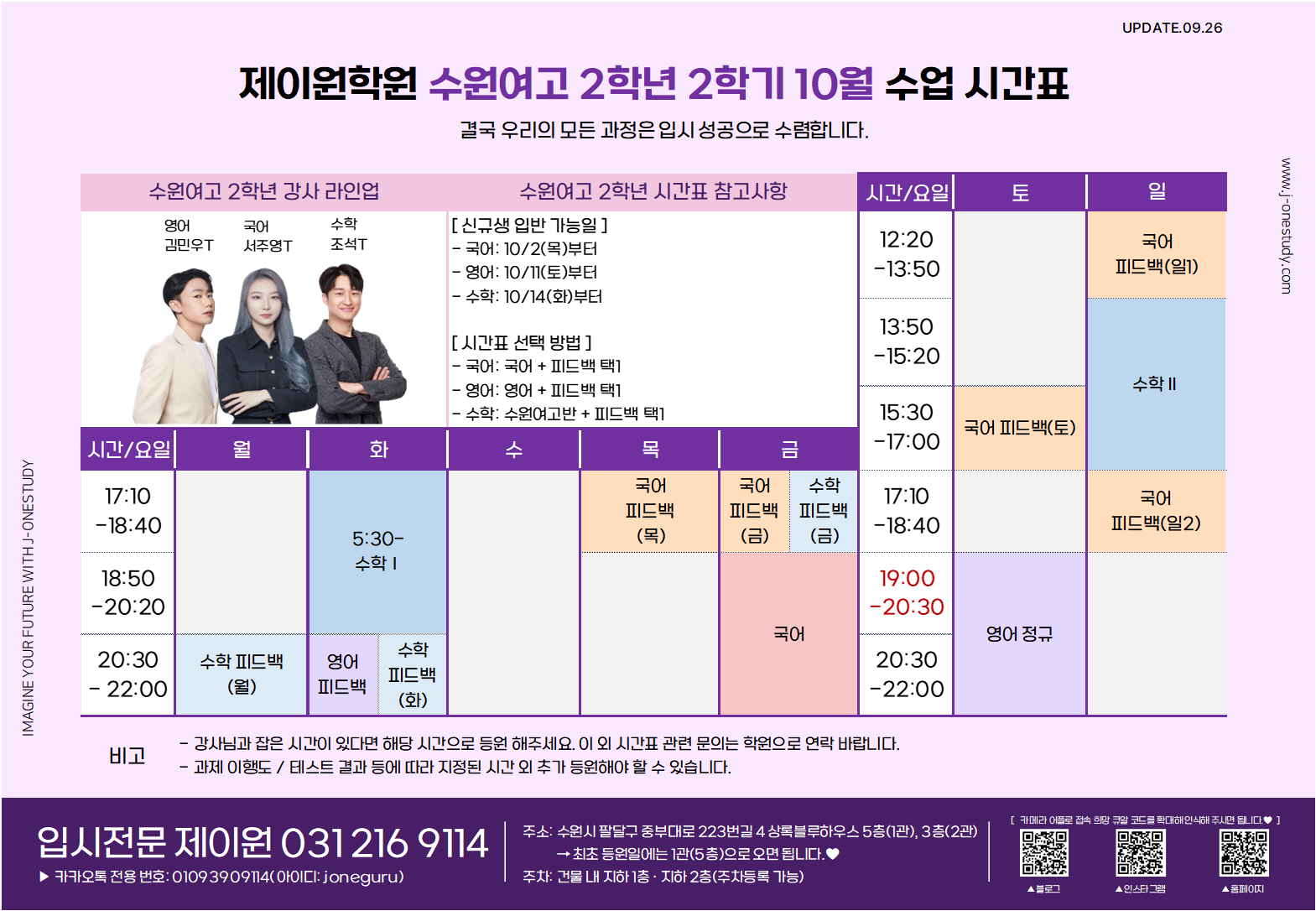 제이원학원 10월 학년별 주요 내용 및 시간표 안내 드립니다.