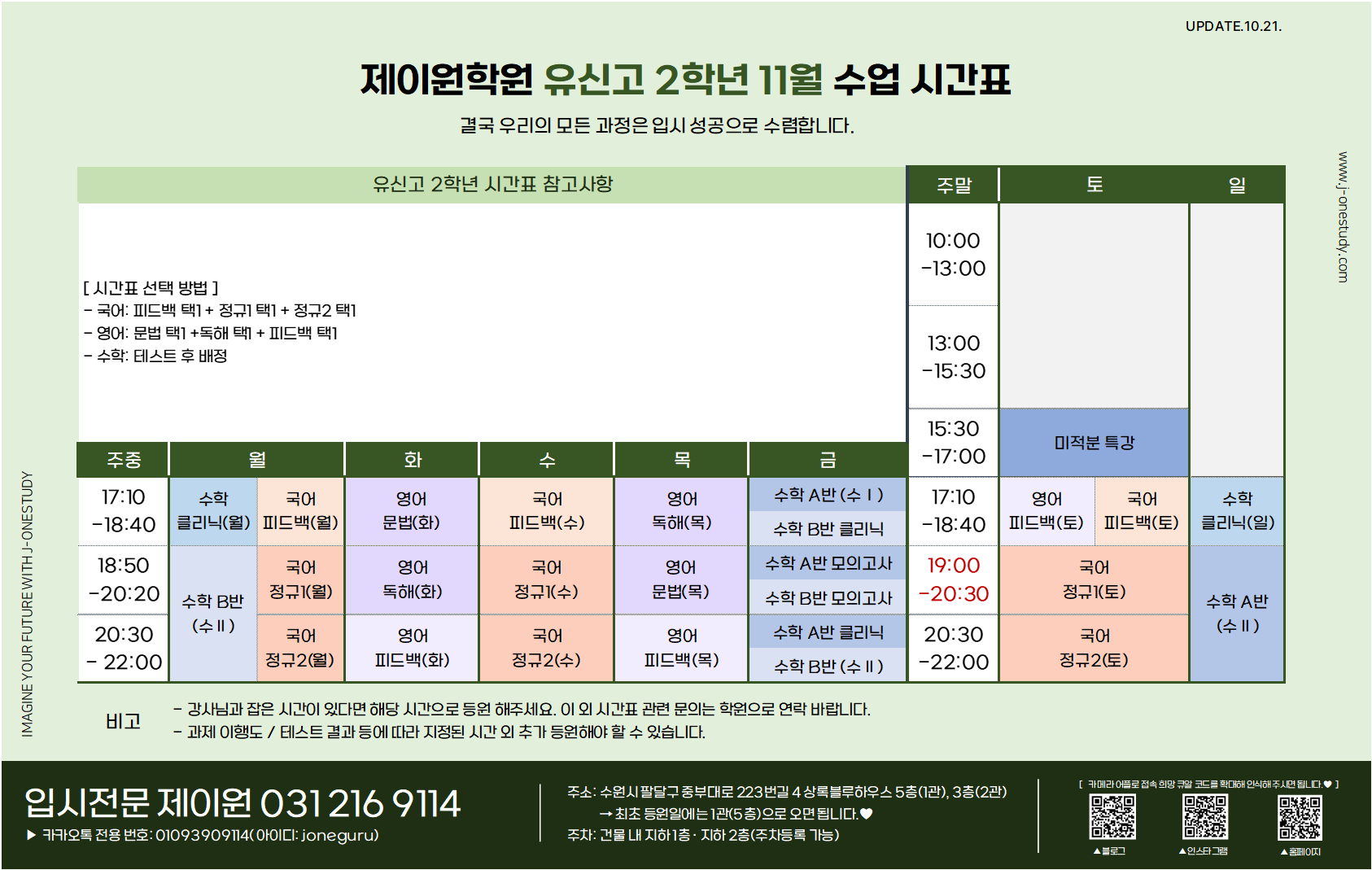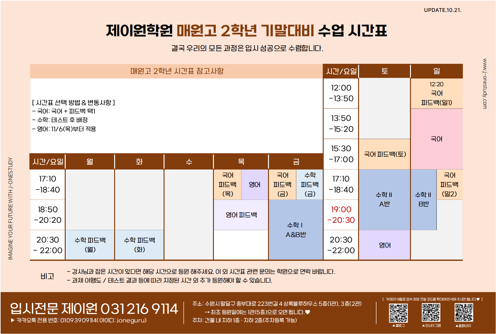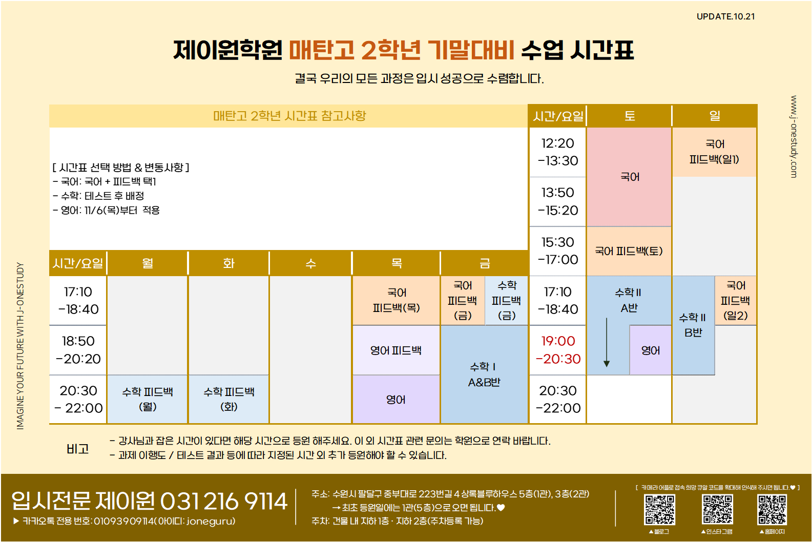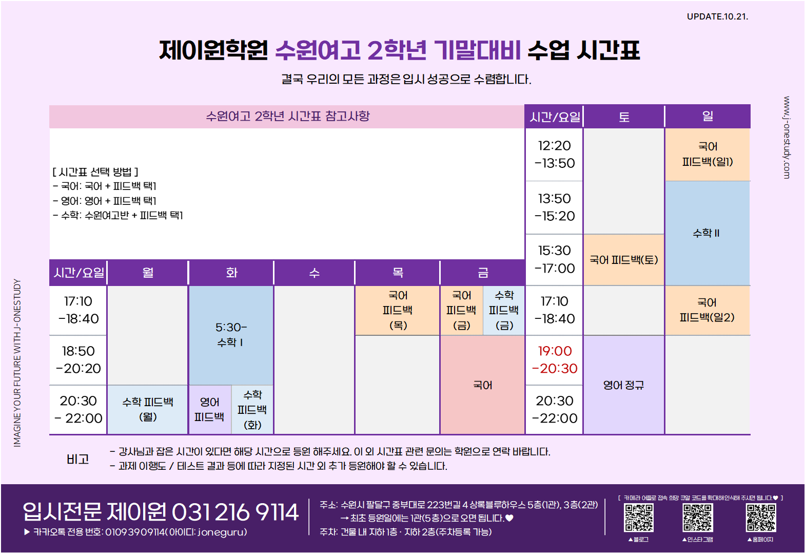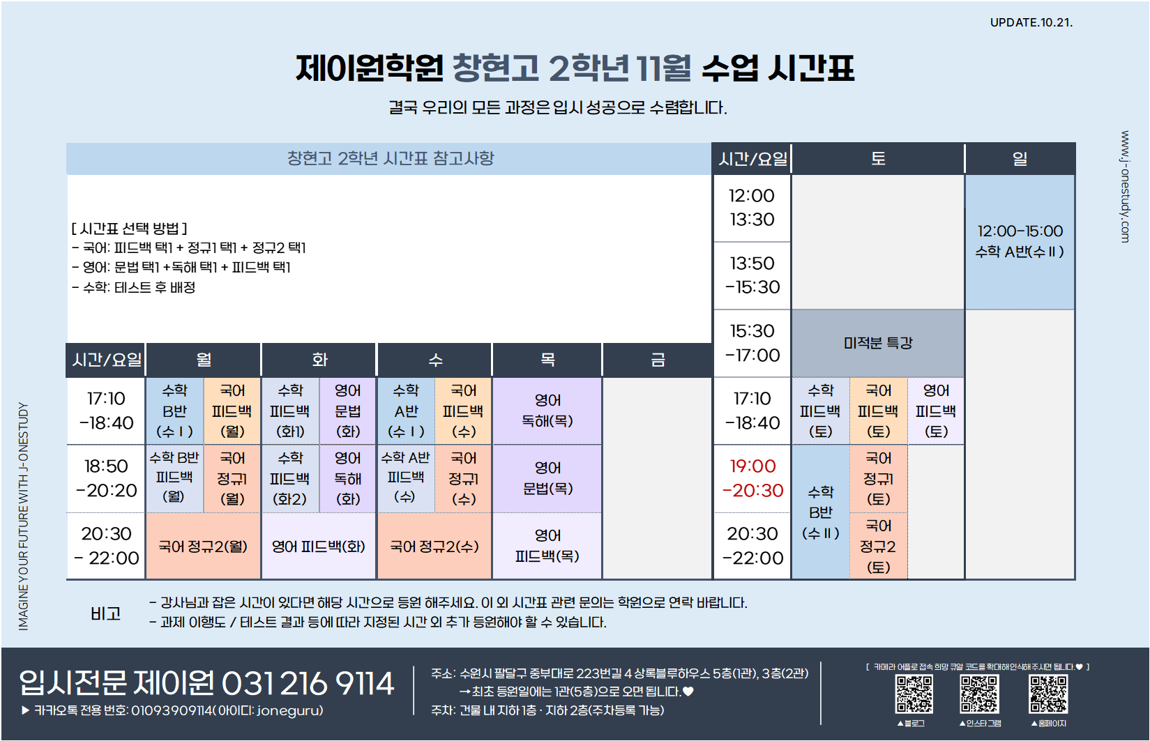 제이원학원 학년별 주요 내용 및 시간표 안내 드립니다.
