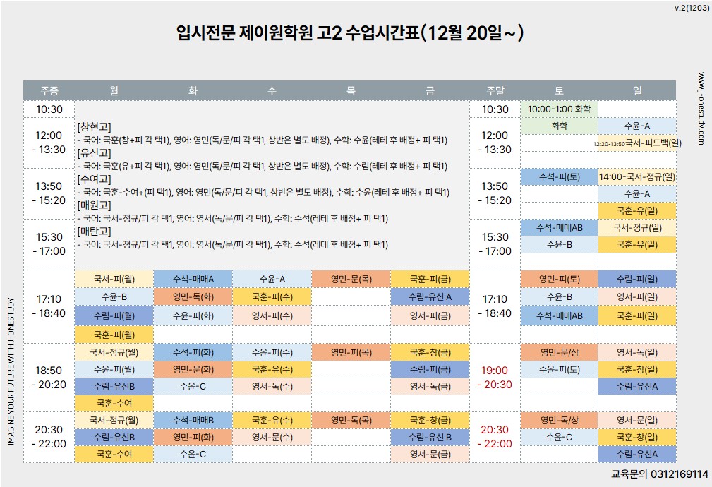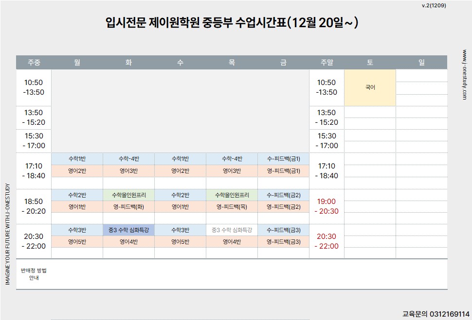 12월 20일부터 적용되는 학년별 시간표 안내 드립니다.