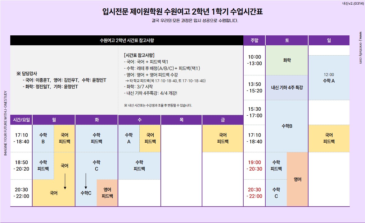 제이원학원 고2 3월 시간표