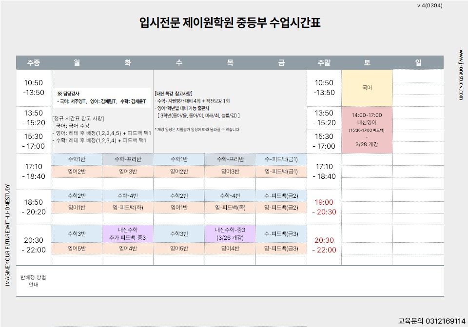 제이원학원 중등부 3월 시간표