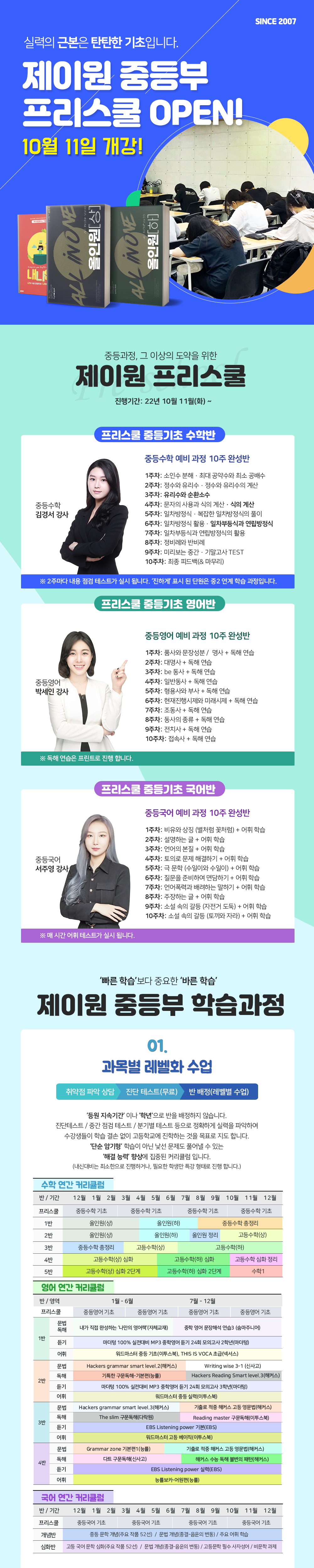 ※ 중등부 프리스쿨 주차별 커리큘럼은 수업 진행 상황에 따라 변동 될 수 있습니다.