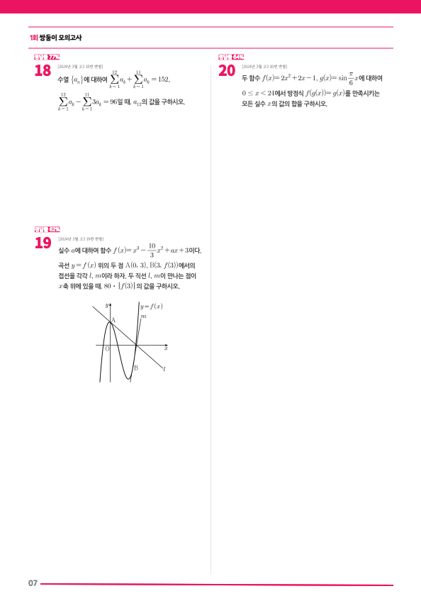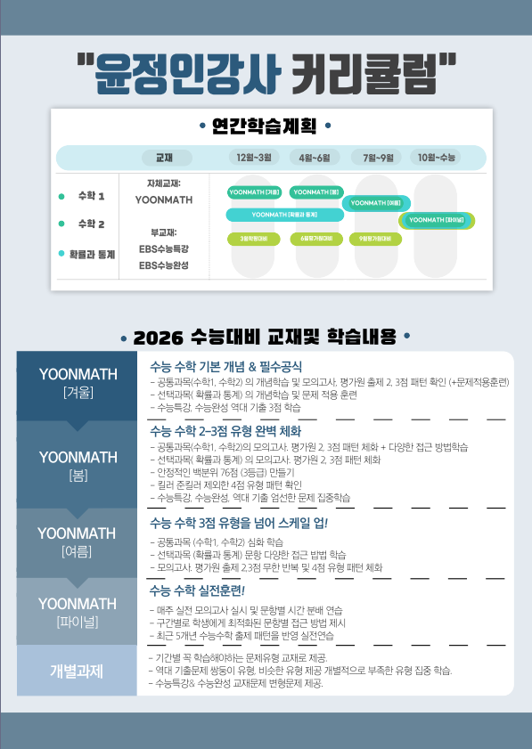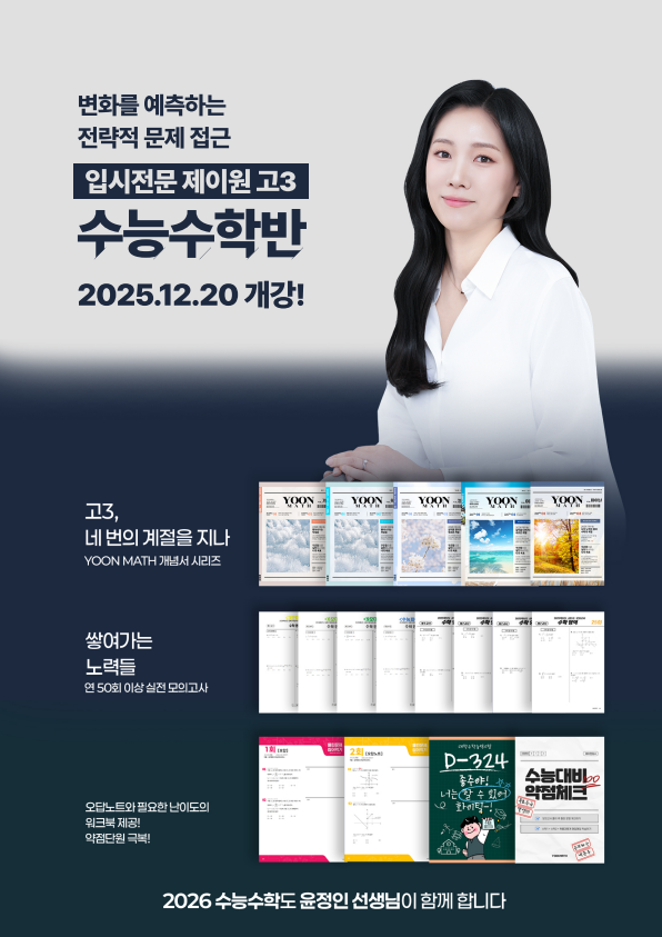 윤정인 선생님 수업을 들으면 개념이 잘 잡혀서 심화 문제의 접근도 가능하다. 그리고 개념을 배울 때마다 과제를 내주셔서 개념과 나올 수 있는 유형들이 전체적으로 잘 잡힌다. 선생님의 수업을 듣고 수학 성적이 많이 올랐고, 수학에 대한 자신감이 생겼다.!