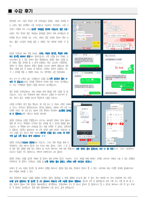 여기 오기 전 수학이 싫고 두려웠는데 수업을 듣고 수학 공포증이 많이 사라진 것 같습니다. 모르는 문제를 친절하게 자세히 알려 주셔서 감사했습니다. 지난 7개월동안 열심히 수업을 해주셔서 감사했습니다.