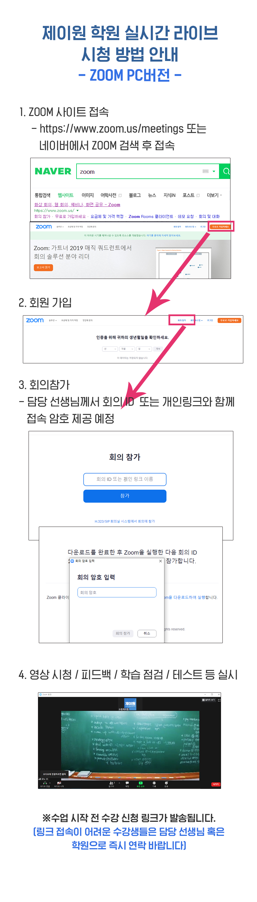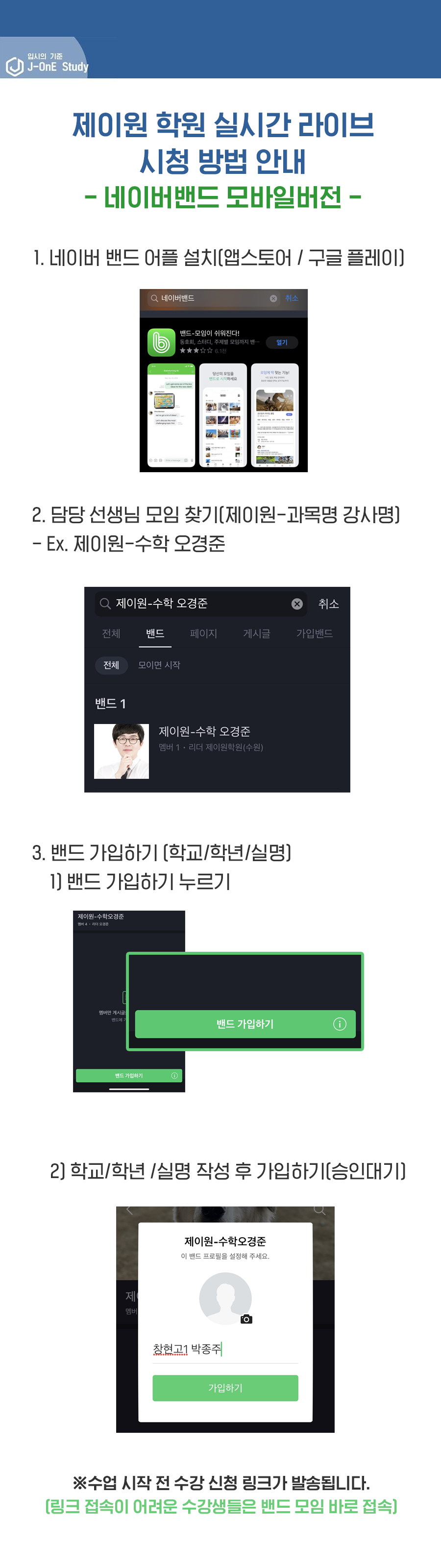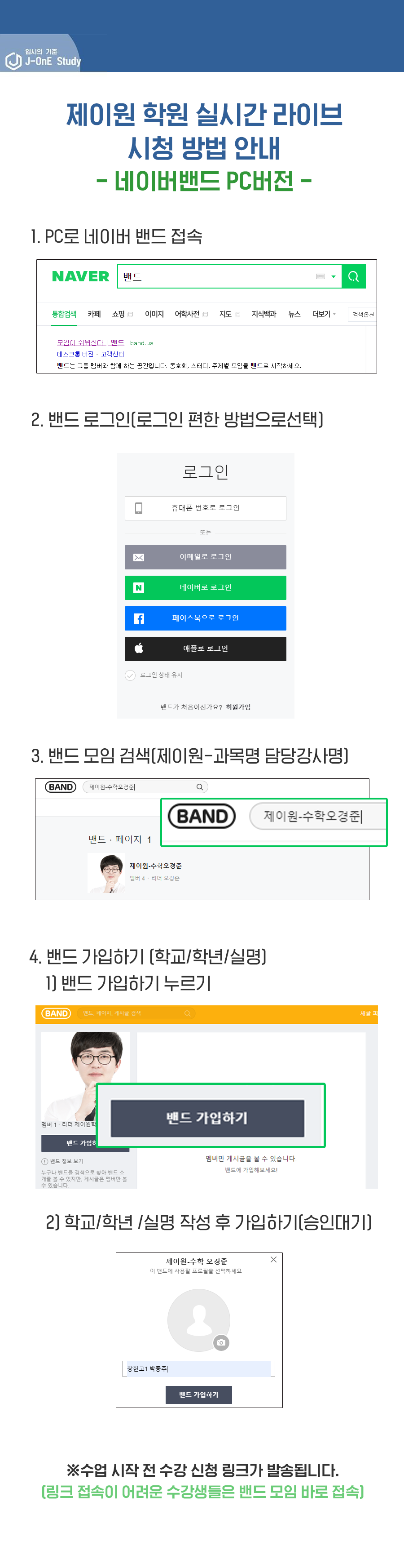 홈 학원안내 프로그램 제이원 비대면 실시간 강의 시청 방법(밴드/줌)