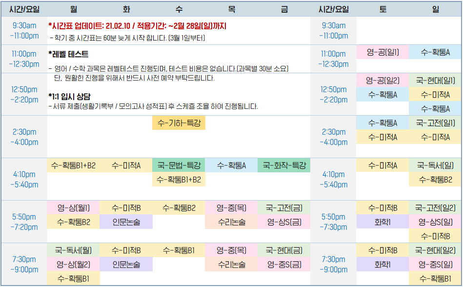 홈 학원안내 프로그램 제이원 대면 수업 시간표 (21.01.16~21.02.28)