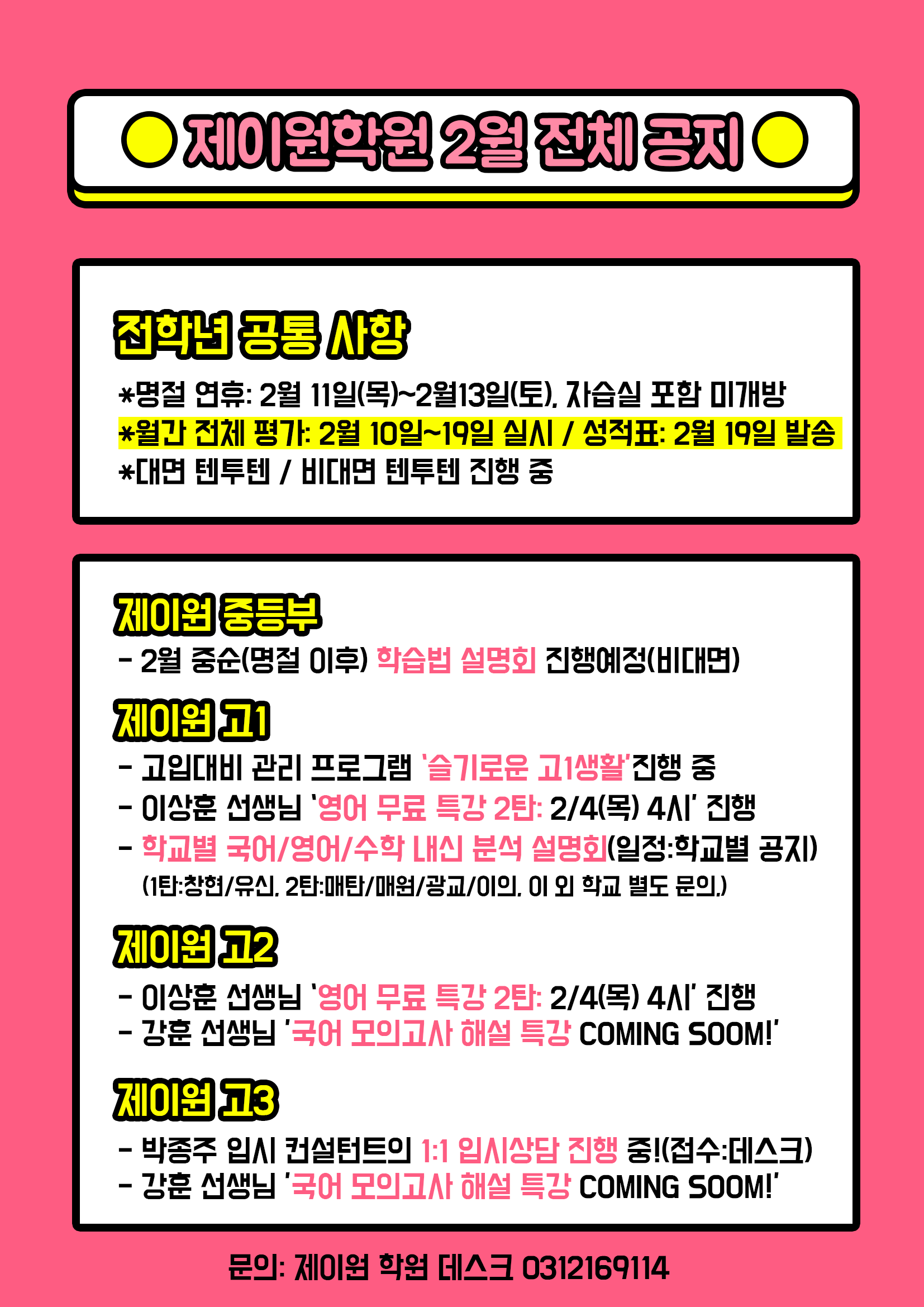 홈 학원안내 프로그램 ♥ 제이원 학원-2월 전체 공지♥