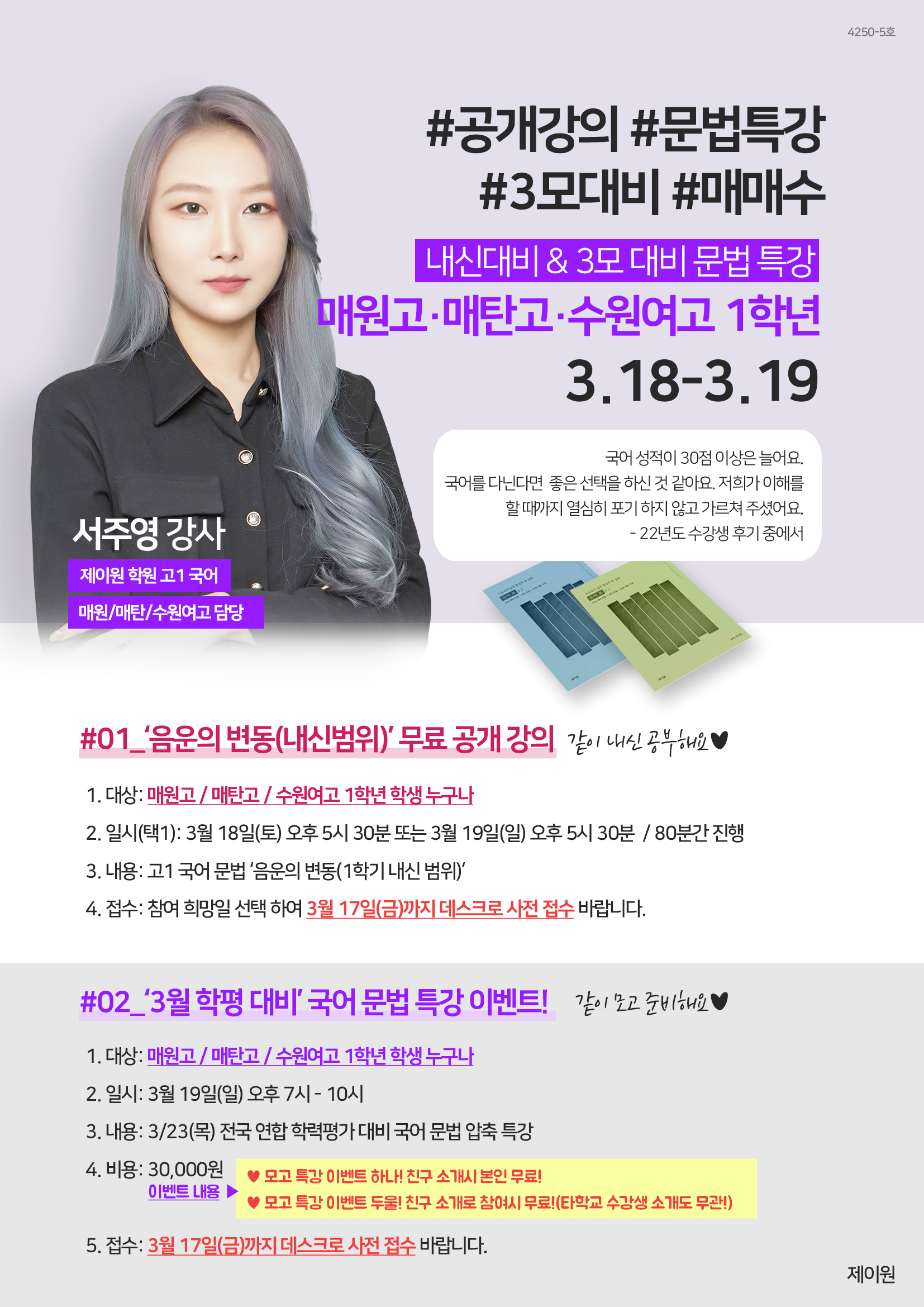 홈 학원안내 프로그램 [서주영T]매원/매탄/수여 1학년 국어 내신대비 공개강의 & 모고대비 문법 특강
