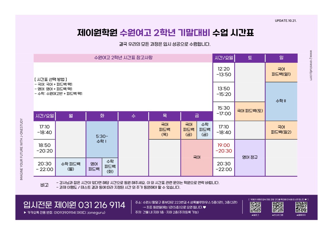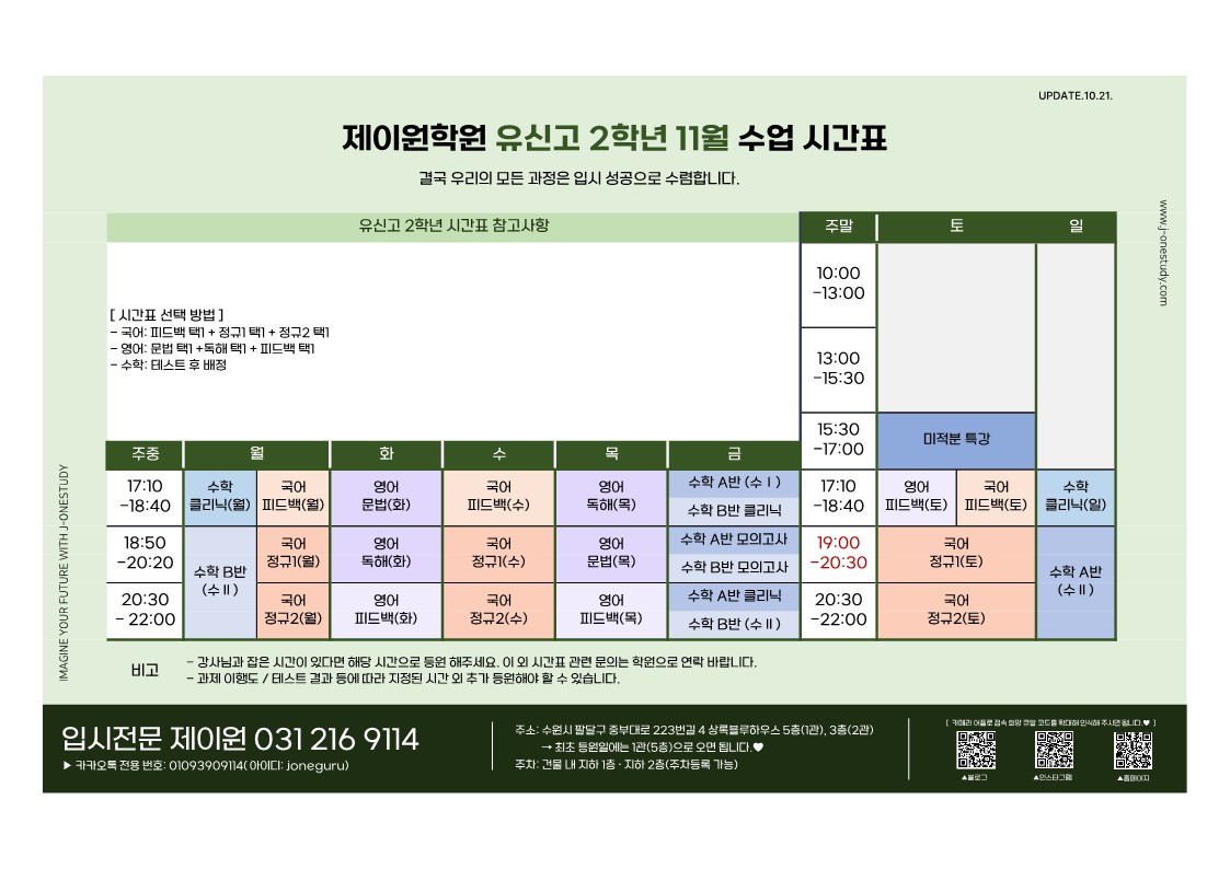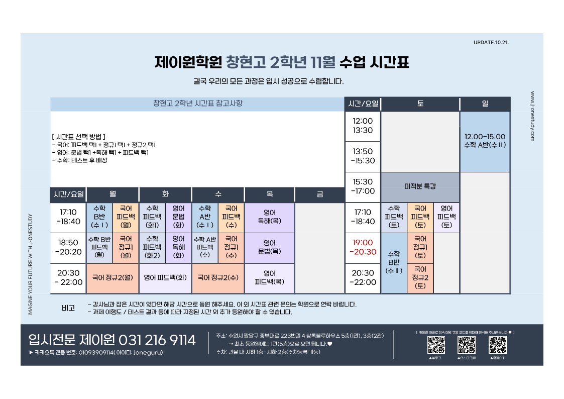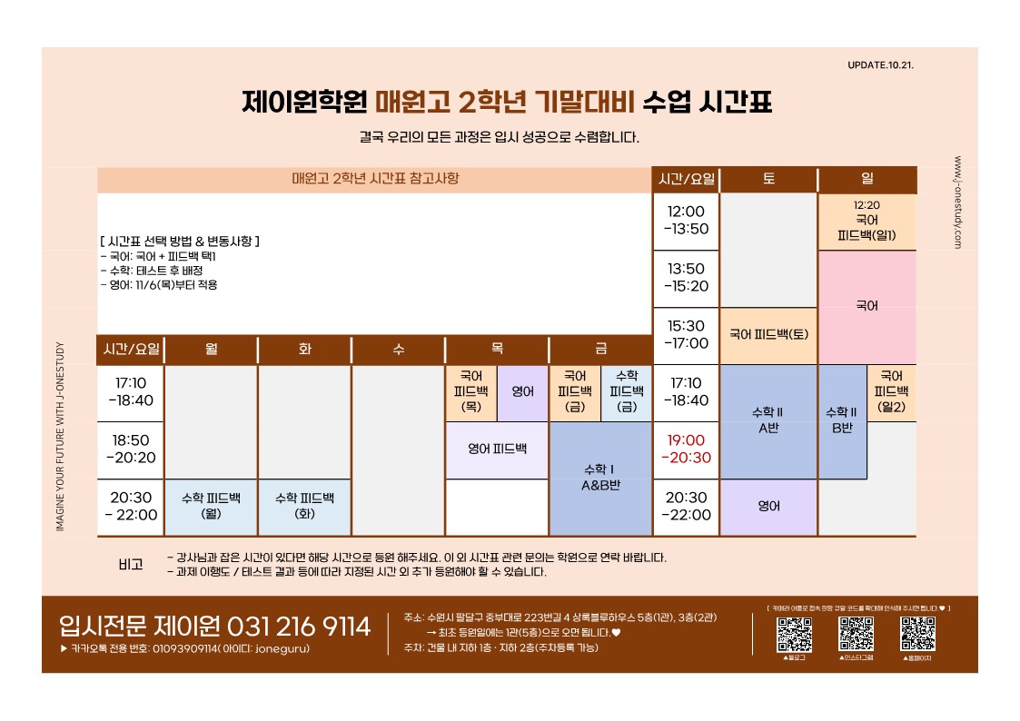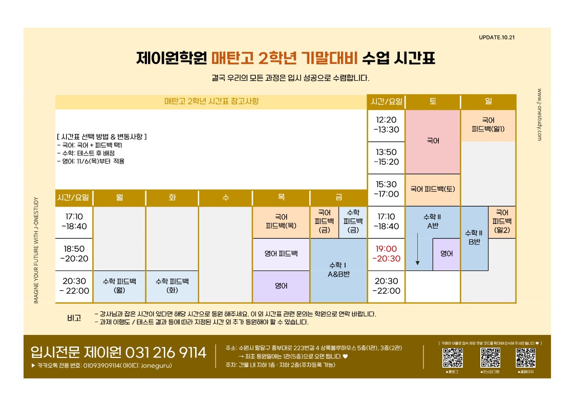 수업 시간표 관련 문의는 학원으로 연락 부탁드립니다.