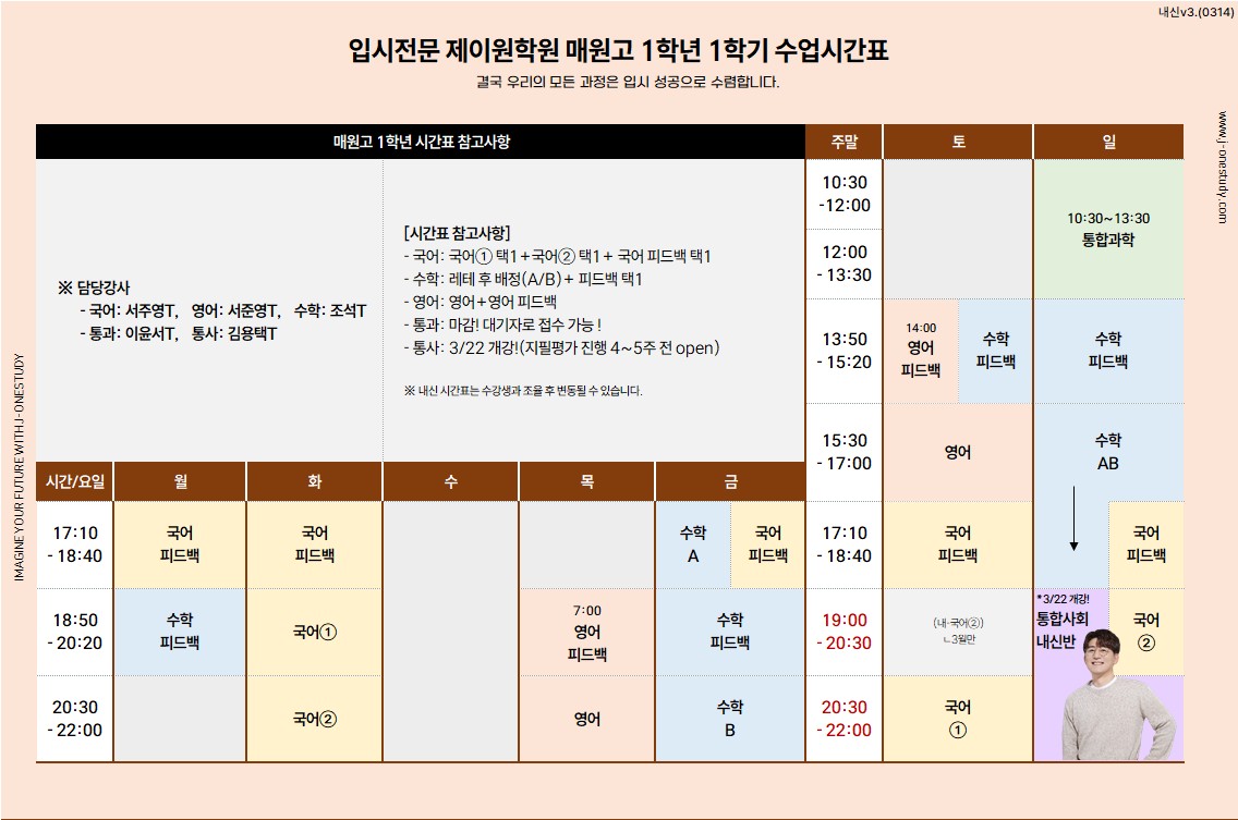 제이원학원 고1 3월 시간표