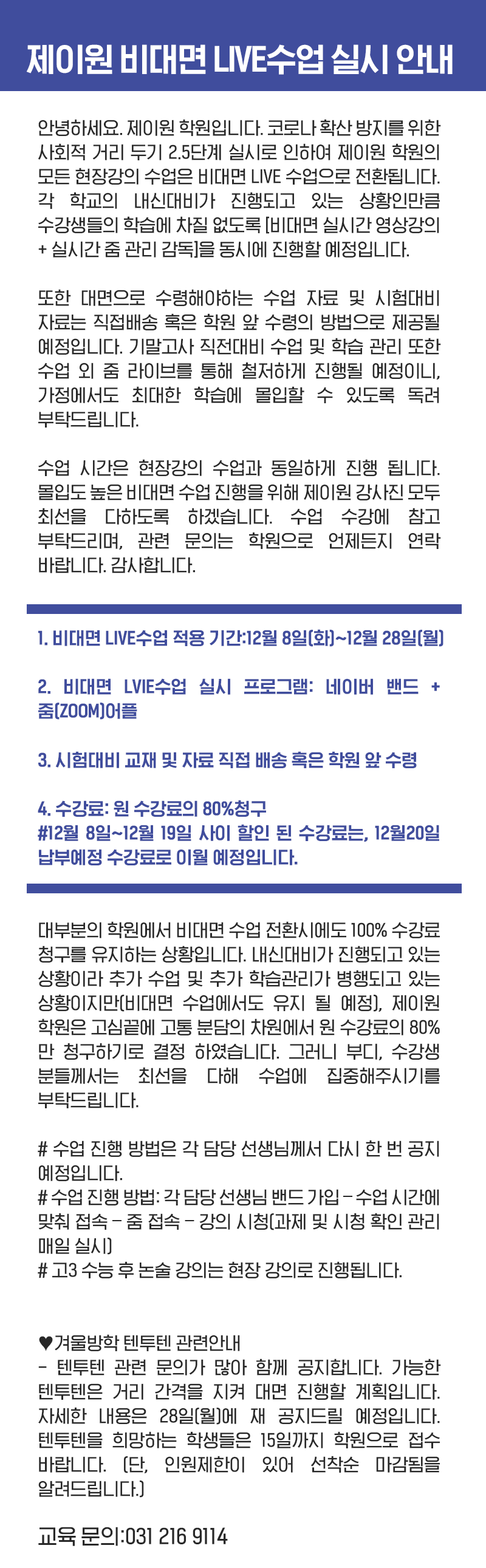 12/8~12/28 제이원학원 수업 안내
