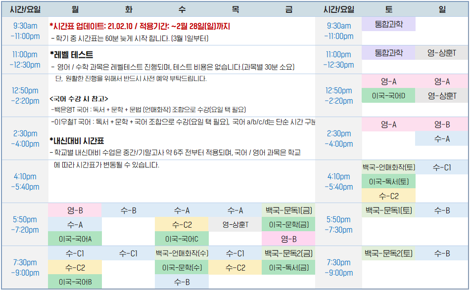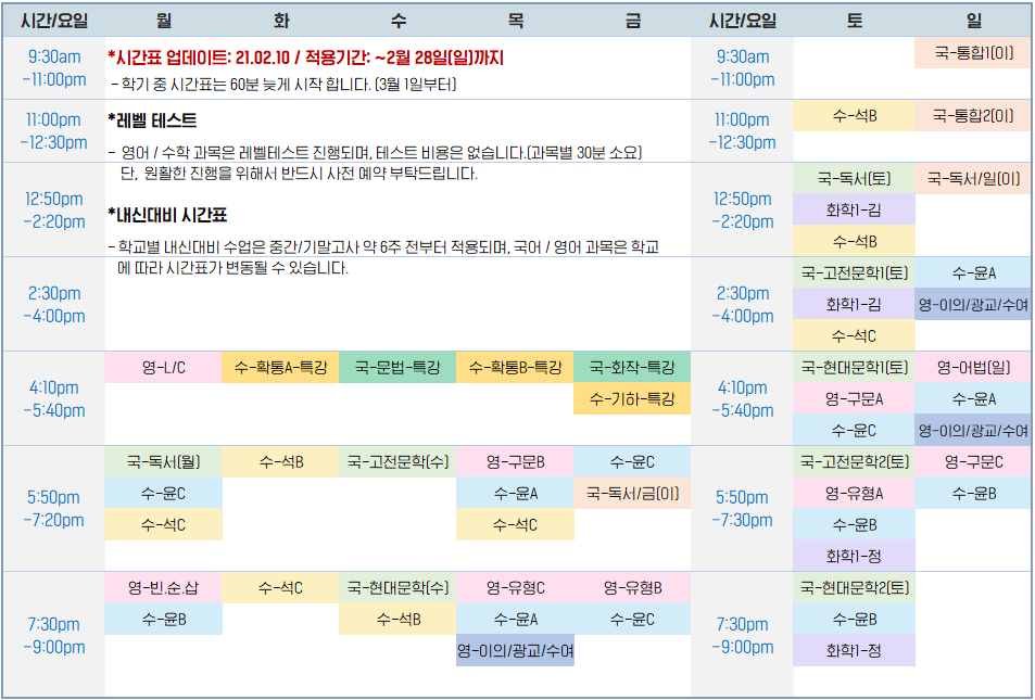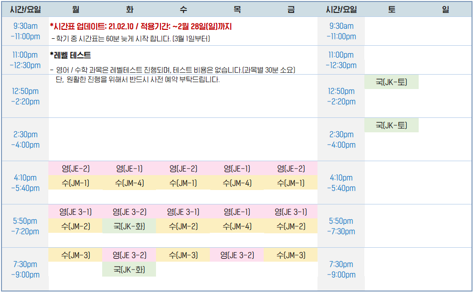 제이원 대면 수업 시간표 (21.01.16~21.02.28)