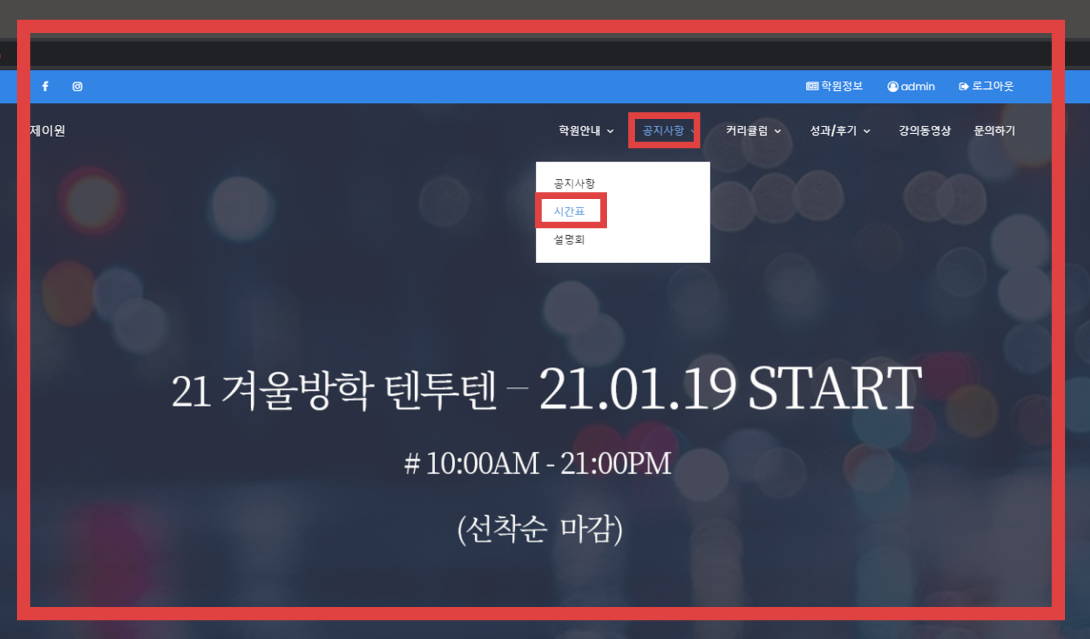 제이원 학원 시간표는 [메뉴탭-공지사항-시간표]에서 학년별 확인할 수 있습니다. ~^^