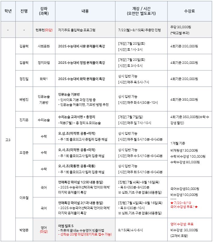 ※ 7.3 변동 내용: 고3 국어 언매특강 기초/심화 내용 구분 없습니다. (동일 내용 2회 진행)