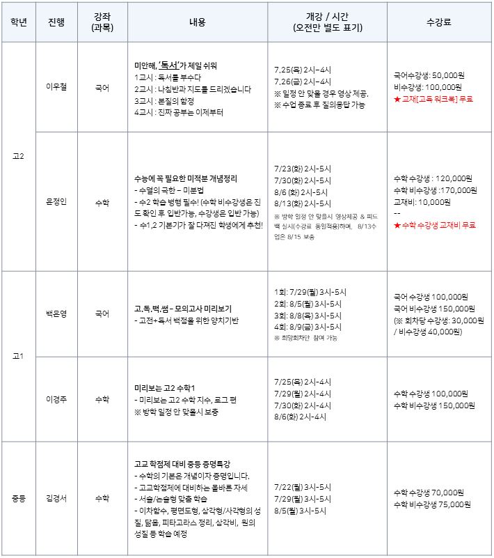 1. 학원 방학[7/31(수)~8/2(금)]에는 정규 수업 및 방학 특강이 진행되지 않습니다.