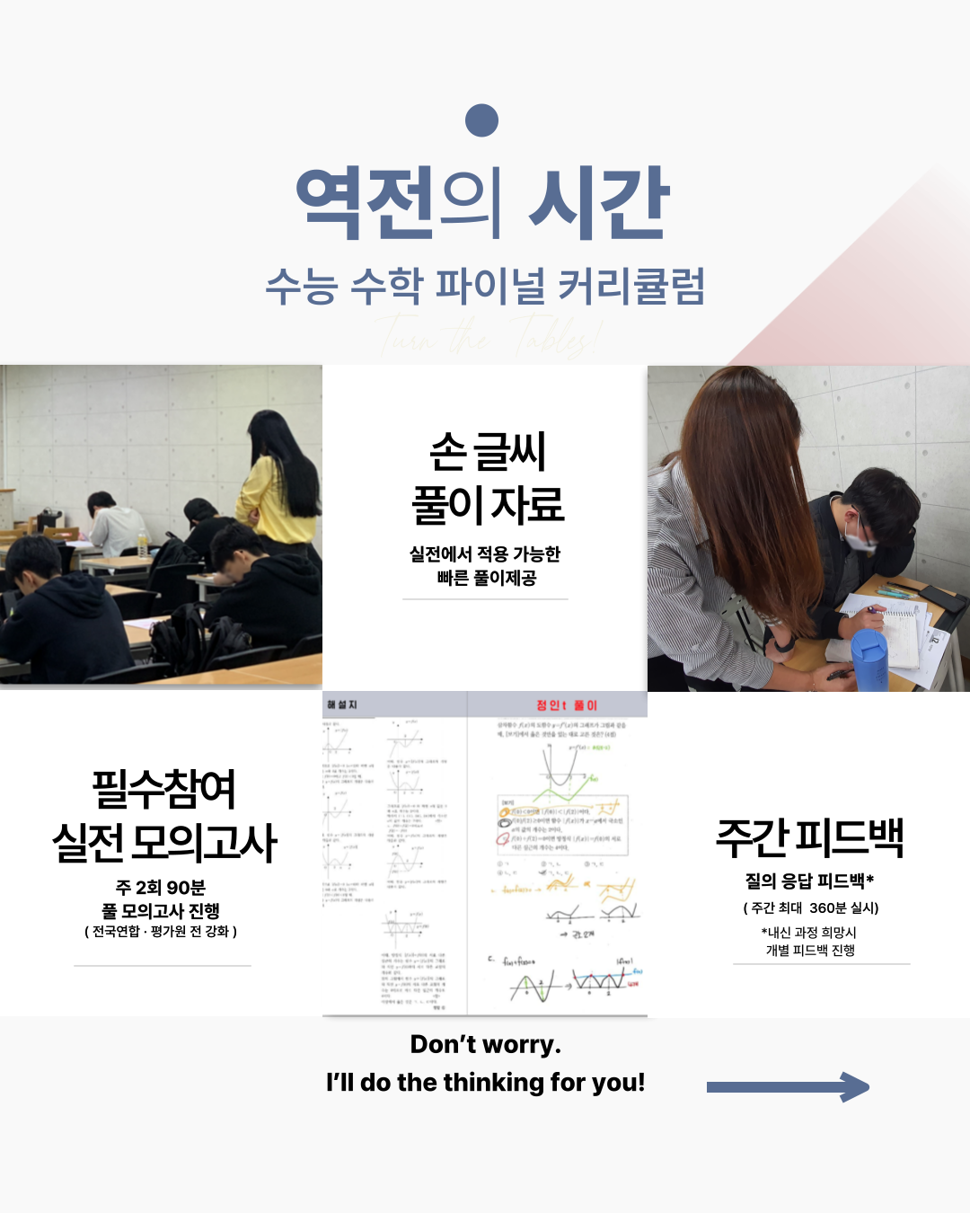 여기 오기 전 수학이 싫고 두려웠는데 수업을 듣고 수학 공포증이 많이 사라진 것 같습니다. 모르는 문제를 친절하게 자세히 알려 주셔서 감사했습니다. 지난 7개월동안 열심히 수업을 해주셔서 감사했습니다.