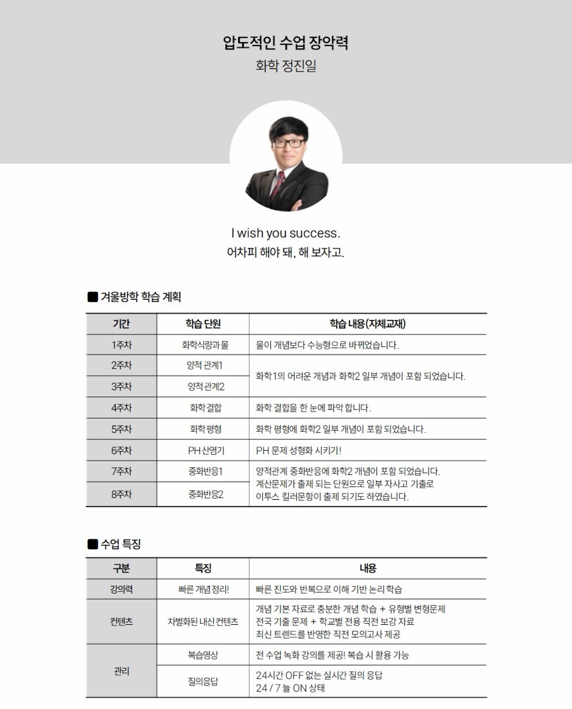 정진일 선생님 통합과학 수업을 내신대비 기간에 한 달 들었는데 우선 정말 재미있었습니다. 선생님의 입담이 너무 좋아서 수업이 재미있고 재미있는 만큼 집중도 잘 되는 그런 수업이였습니다. 문제 프린트 등 제공해주시는 자료도 많으셔서 시험대비 하는데 전혀 부족함 없이 보냈습니다. 또한 수업 중간중간 해주시는 이야기들이 재미있고, 또 배경지식을 넓히는데 아주 좋았다는 생각이 들었습니다. 마지막으로 내신 끝나고 진행한 논술 수업에서 선생님께 기본적으로 어떻게 하면 인성점수에서 감점 당하지 않는지와 화술 등을 배웠는데, 저는 개인적으로 이 수업이 가장 재미있었고 기억에 남을거 같다는 생각이 들었습니다.