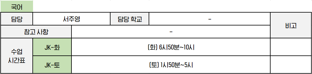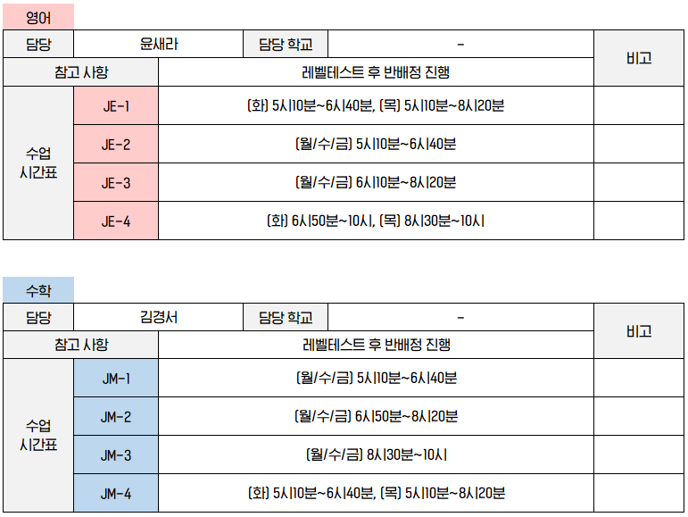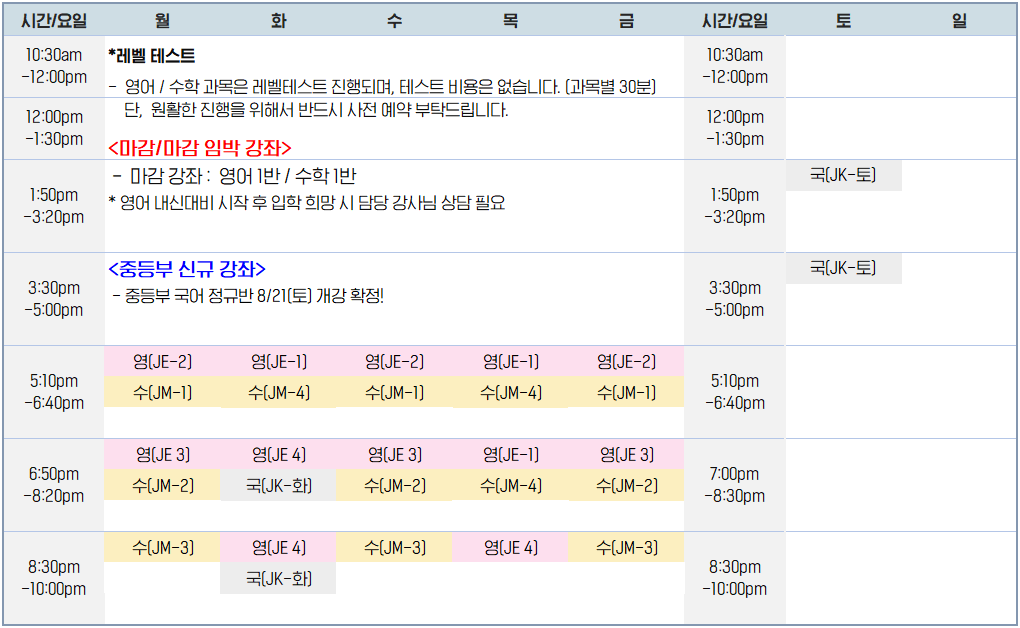 [제이원 중등부 수업 시간표]