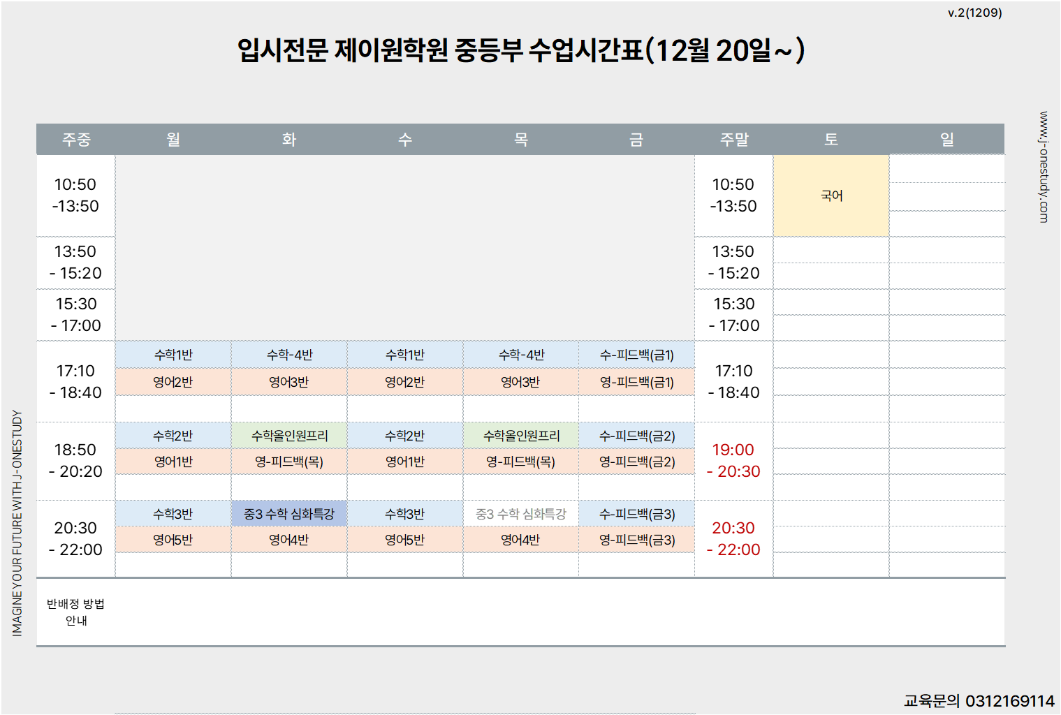 수업 시간표 관련 문의는 학원으로 연락 부탁드립니다.